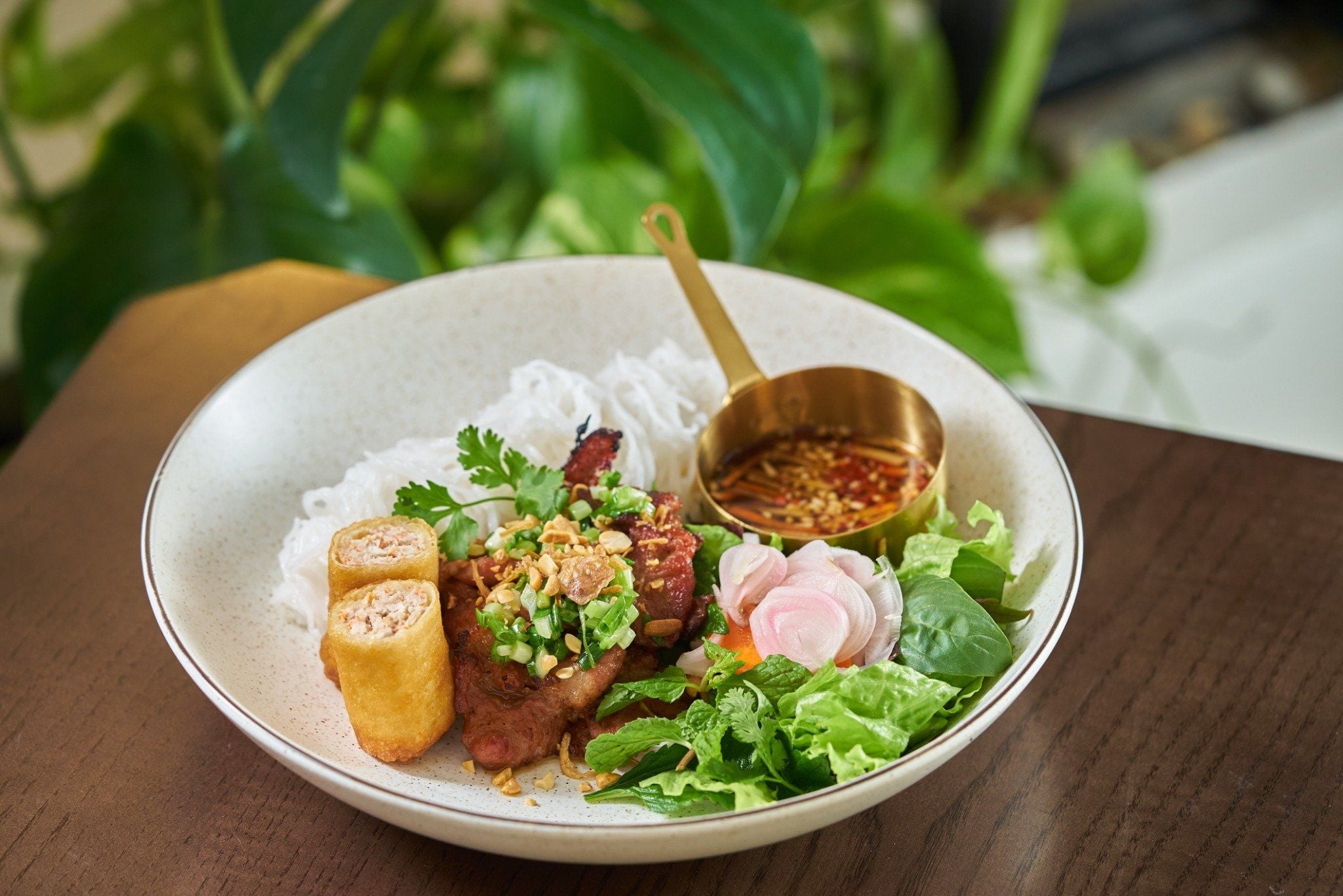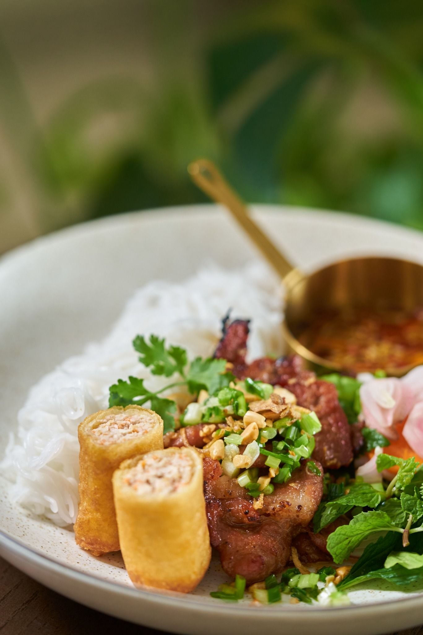 Hấp dẫn với thịt heo nướng vàng ươm, thơm lừng mùi sả và gia vị, xếp trên nền bún trắng mềm mại cùng rau sống tươi xanh. Chan thêm chút nước mắm chua ngọt đậm đà, rắc thêm đậu phộng rang giòn tan. Một món ăn đường phố quen thuộc, đầy ắp hương vị đặc trưng của Sài Gòn.